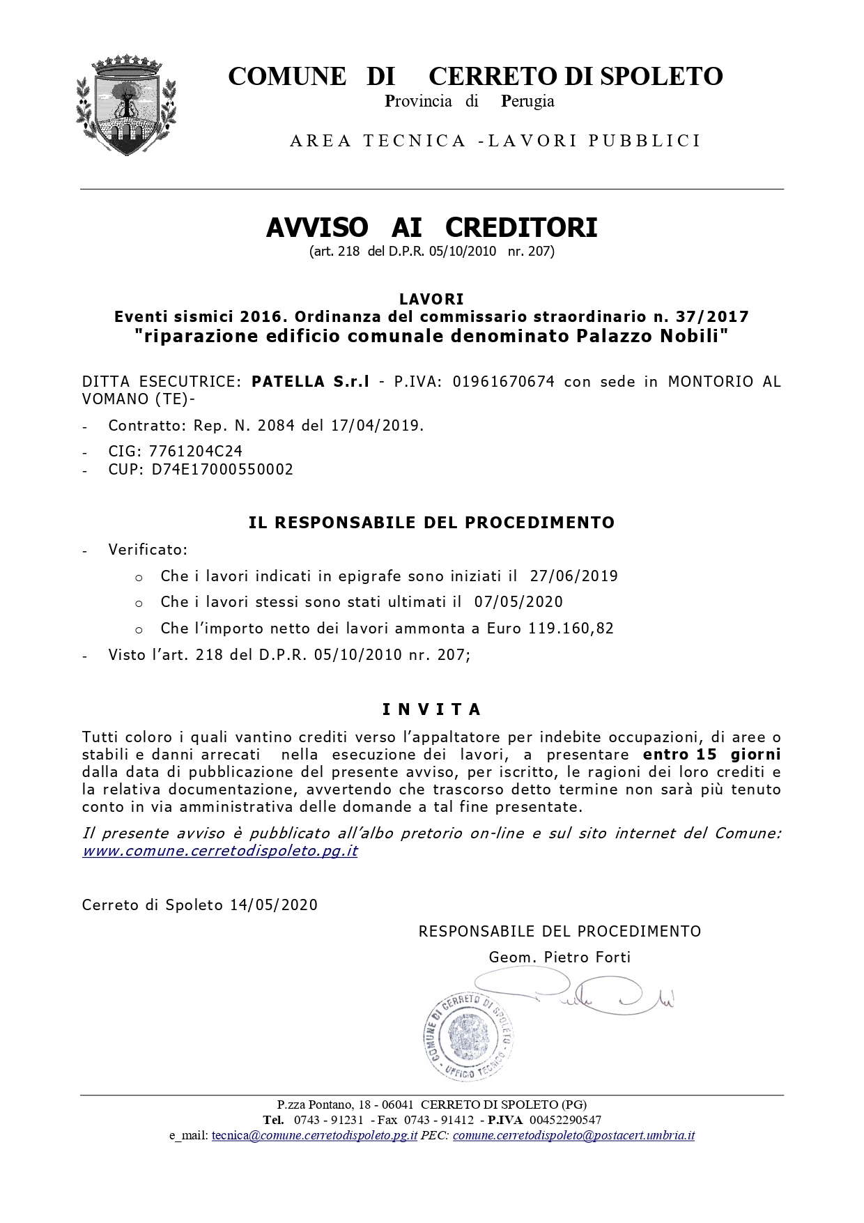 AVVISO AI CREDITORI (art. 218 del D.P.R. 05/10/2010 nr. 207) LAVORI Eventi sismici 2016. Ordinanza del commissario straordinario n. 37/2017 “riparazione edificio comunale denominato Palazzo Nobili”