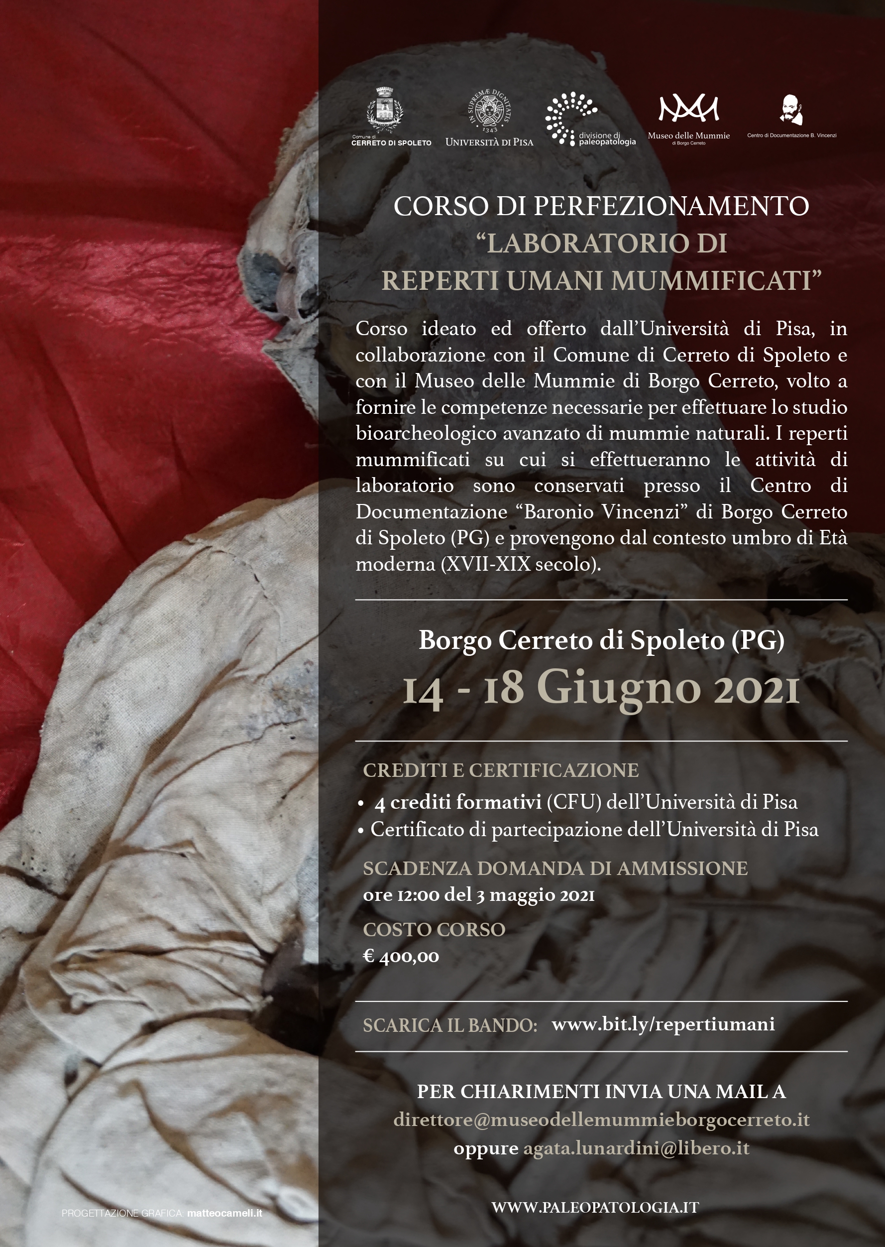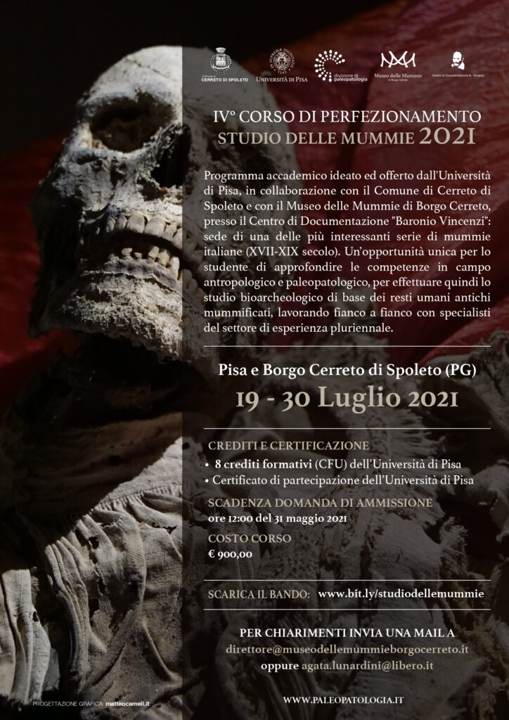 Pubblichiamo importanti corsi organizzati dall’Università degli Studi di Pisa, in collaborazione con la dott.ssa Agata Lunardini, Direttrice del Museo delle Mummie sito in loc. Borgo Cerreto del Comune di Cerreto di Spoleto.