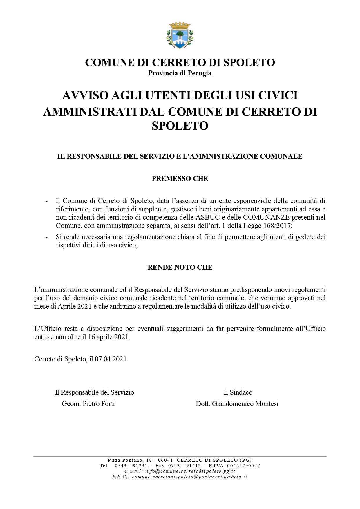 • AVVISO AGLI UTENTI DEGLI USI CIVICI AMMINISTRATI DAL COMUNE DI CERRETO DI SPOLETO