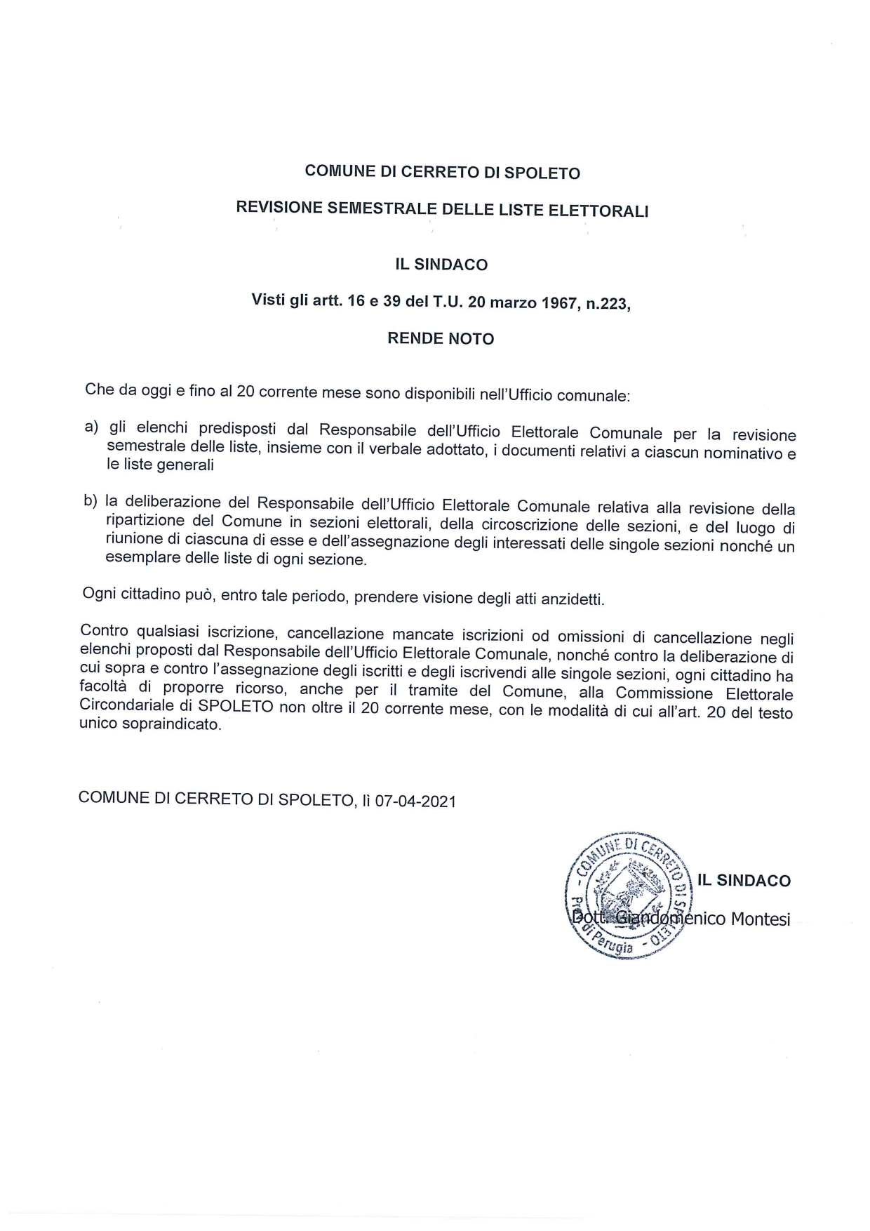 - Revisione semestrale delle liste elettorali – Affissione manifesto