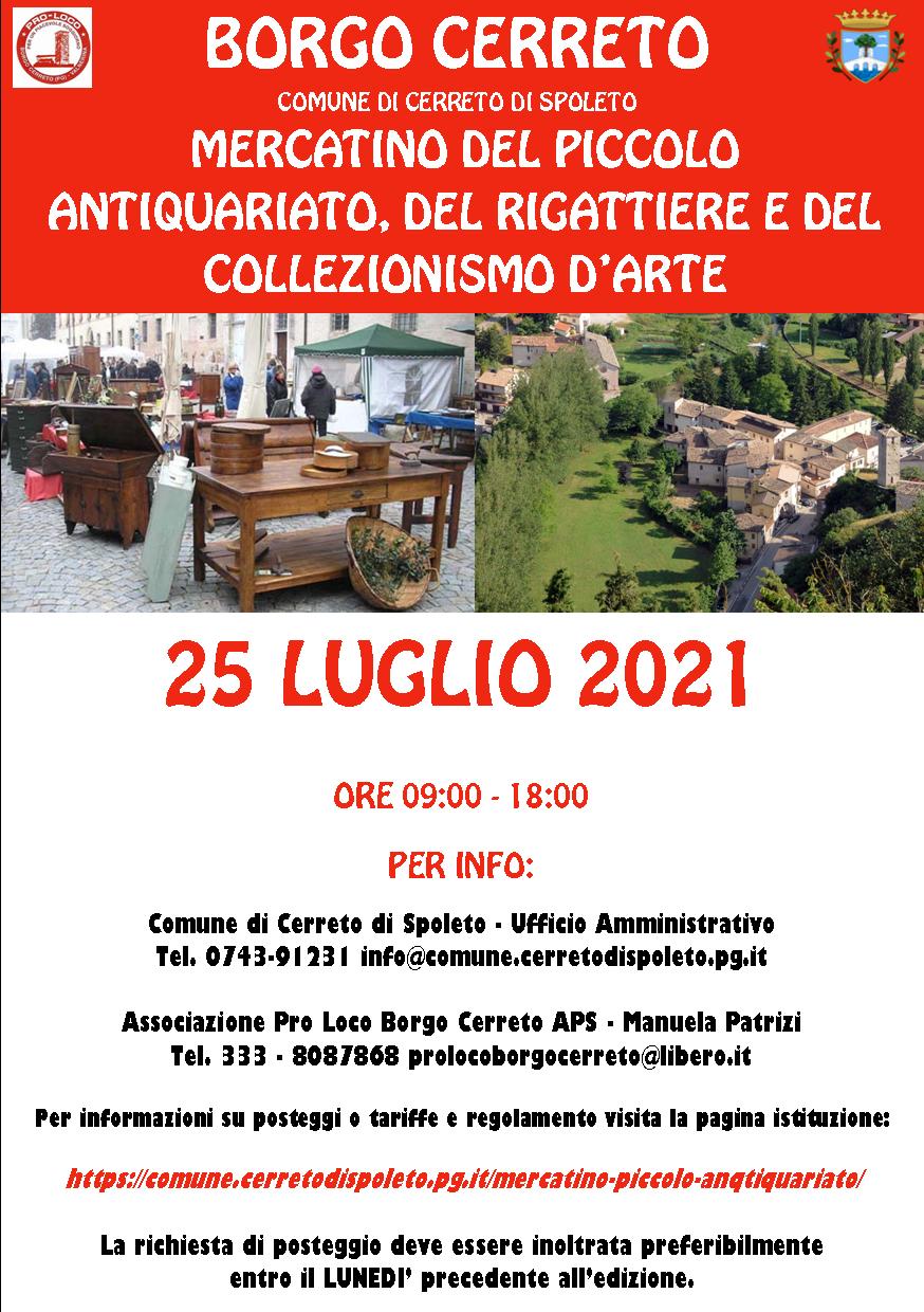 È ufficiale la partenza del mercatino del piccolo antiquariato, del rigattiere e del collezionismo d’arte di Borgo Cerreto, promosso dal Comune di Cerreto di Spoleto, in convenzione con l’Associazione Pro-Loco Borgo Cerreto APS. La prima edizione ufficiale si terrà il giorno 25 luglio 2021. Tutto nella cornice del piccolo borgo in Valnerina, presso l’area giardini di Borgo Cerreto e protagonisti saranno hobbisti, antiquari e collezionisti d’arte.