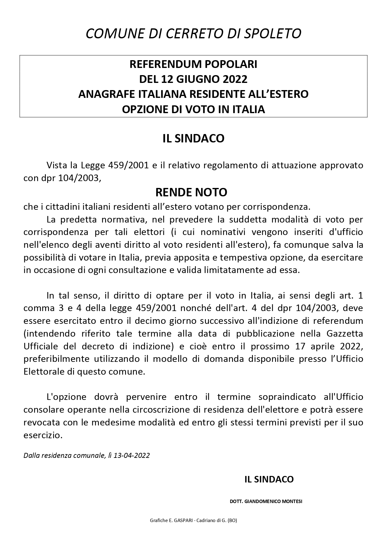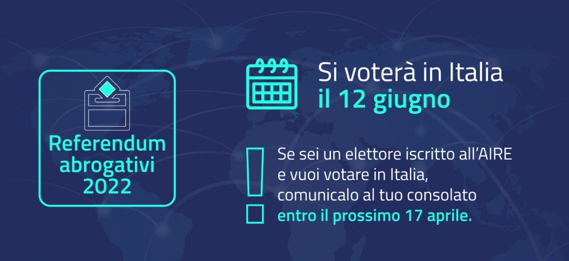 • REFERENDUM POPOLARI DEL 12 GIUGNO 2022 A OPZIONE DI VOTO IN ITALIA PER GLI A.I.R.E.