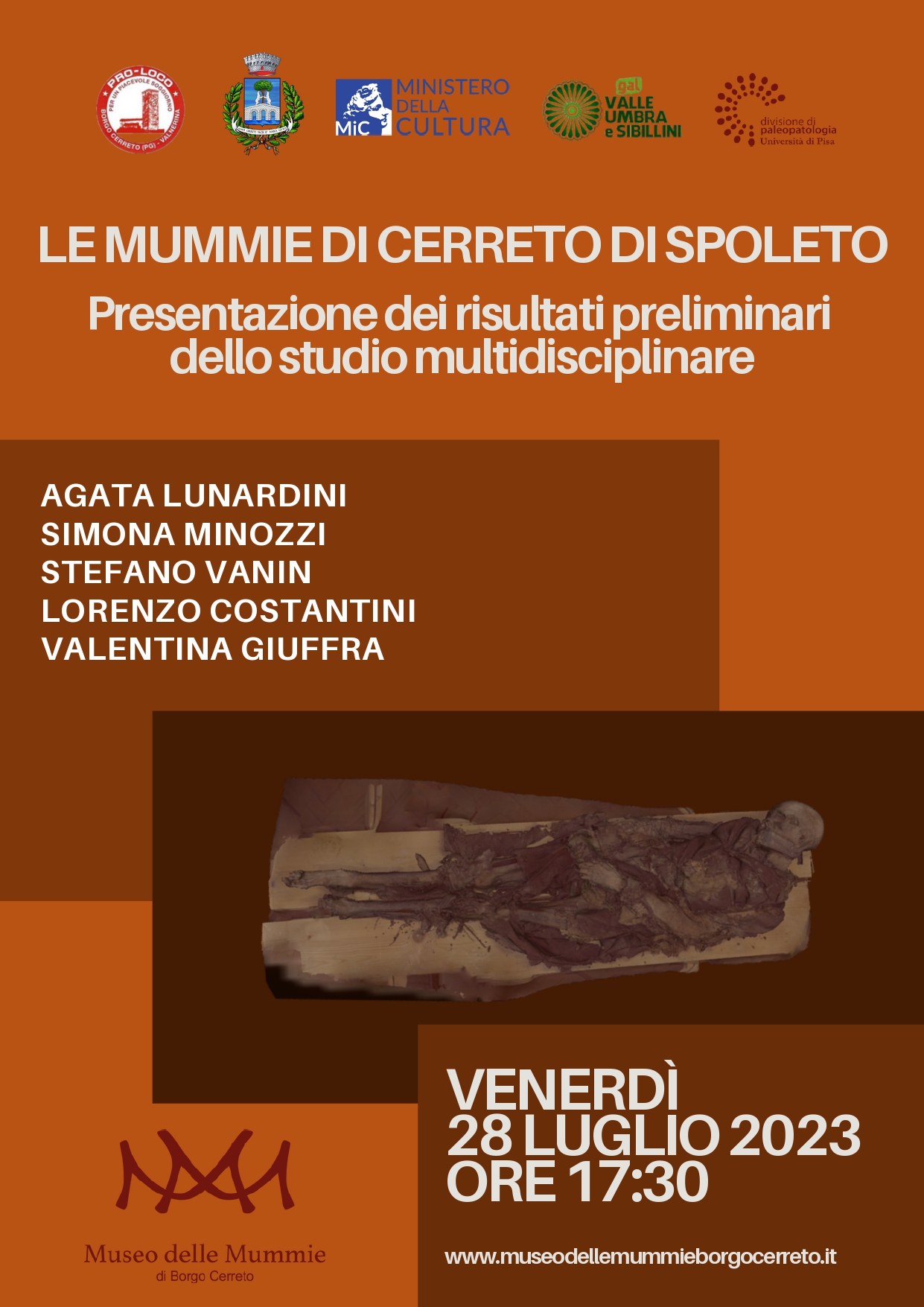 Il 28 luglio 2023, alle ore 17:30, presso il Museo delle Mummie di Borgo Cerreto, Centro di Documentazione “Baronio Vincenzi”, saranno presentati i risultati preliminari dello studio bioarcheologico e multidisciplinare realizzato sulle mummie di Cerreto di Spoleto, recuperate nel 2001 all’interno della Chiesa di Santa Maria Annunziata (XVI secolo) di Cerreto di Spoleto.