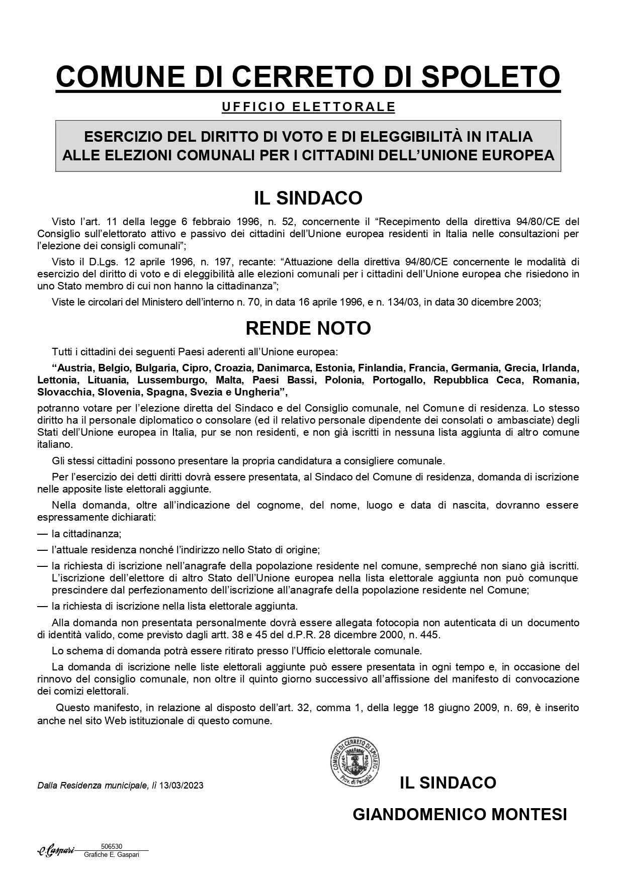 - Elezioni Comunali del 08-09 giugno 2024 – Scadenza perentoria oggi 30 aprile per la richiesta da parte di cittadini UE di partecipare alle elezioni per il rinnovo degli organi del Comune