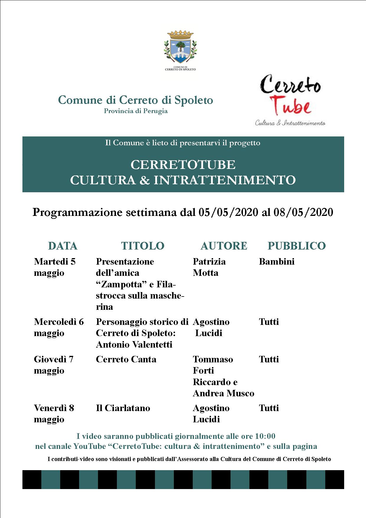 L’Amministrazione Comunale è lieta di presentare il Progetto “CERRETOTUBE: CULTURA & INTRATTENIMENTO“, attraverso il quale intende intraprendere un’iniziativa che ha lo scopo di allietare le giornate dei concittadini ed in generale di tutti coloro che vorranno collegarsi al canale YouTube dedicato “CerretoTube: Cultura & Intrattenimento” e alla pagina ufficiale Facbook del Comune.